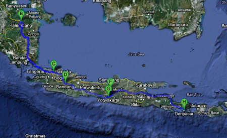 Bestemmingen van onze reis, te beginnen bij zondag 15 juli: van Djakarta naar Pladjoe (B)